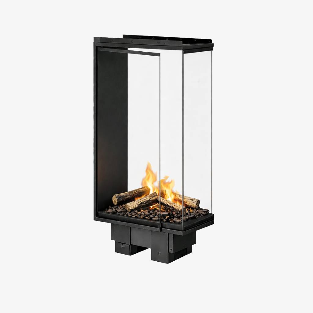 Standaard is de Vaperior Vertical Roomdivider helemaal open. Voor een meerprijs van € 800,- is hij geheel omsloten met glas. De Vaperior Vertical Roomdivider wordt standaard geleverd met de Optimyst cassette 500 met interne waterreservoir. De PureFlames Real Logs heeft een meerprijs van € 450,- (échte verbrande houtstammen set met houtsnippers als bodembedekking).