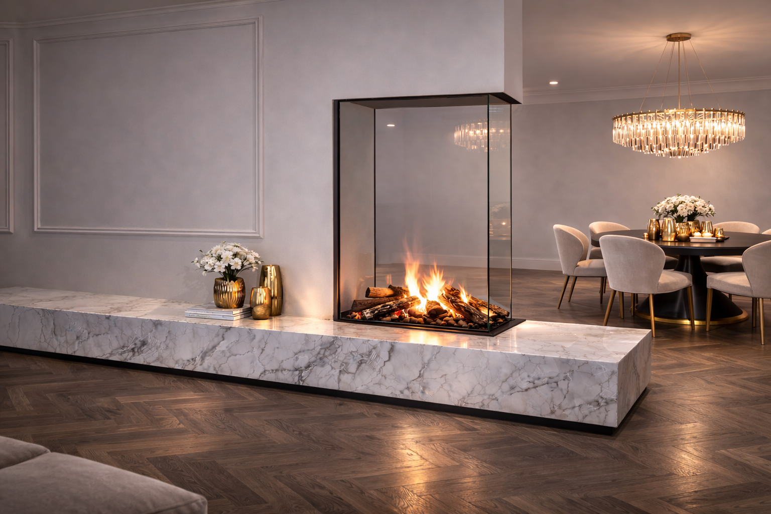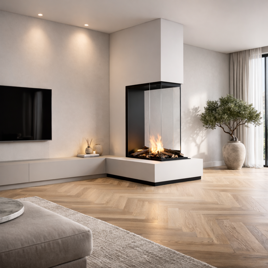 Front, hoek links, hoek rechts, roomdivider, doorkijk of 3-zijdige haard