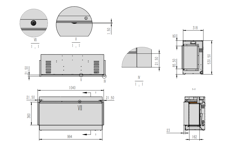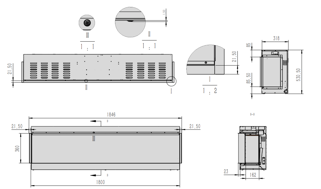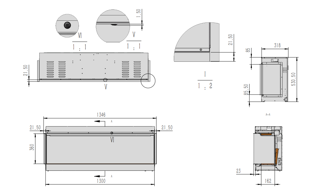 Deze sfeerhaard kunt u naar wens als fronthaard, hoekhaard of als 3-zijdige haard opstellen. Dit toestel is verkrijgbaar in de volgende afmetingen: